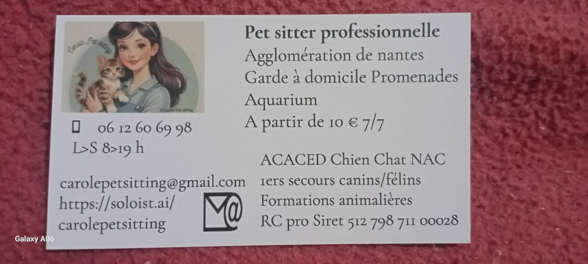 Carole Petsitting est un service de garde d'animaux à domicile proposé par une personne titulaire de l'ACACED (Attestation de Connaissances pour les Animaux de Compagnie d’Espèces Domestiques) pour les chiens, les chats et les NAC (Nouveaux Animaux de Compagnie).