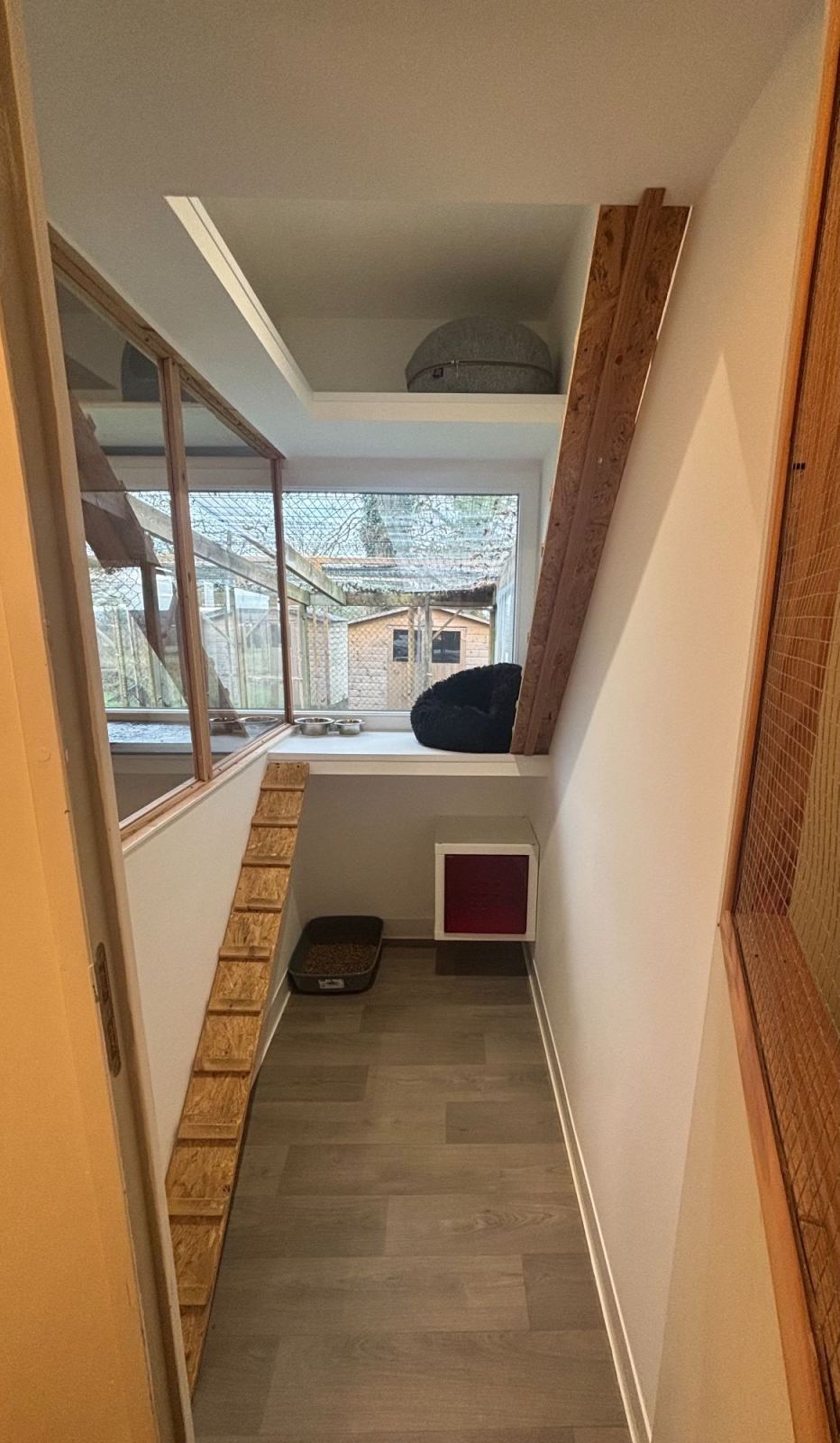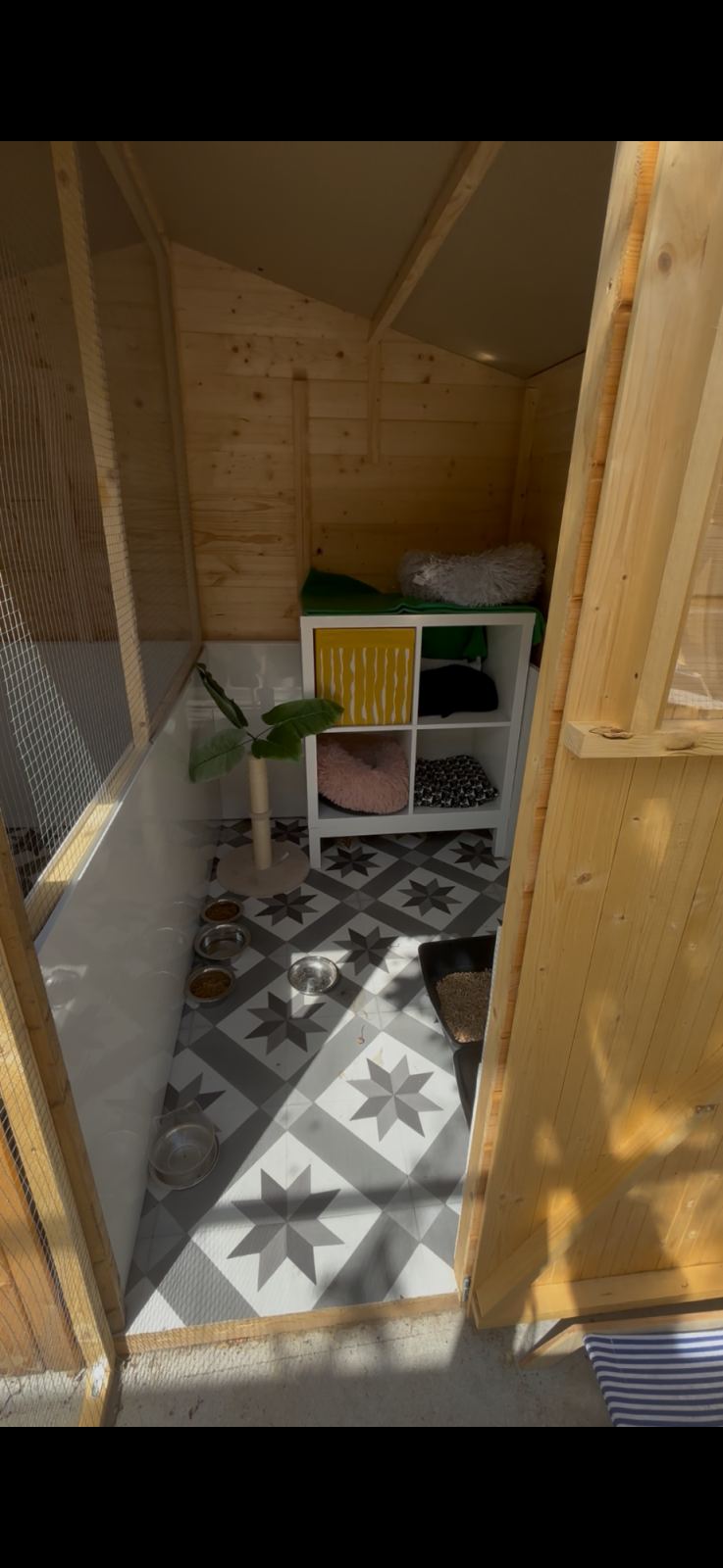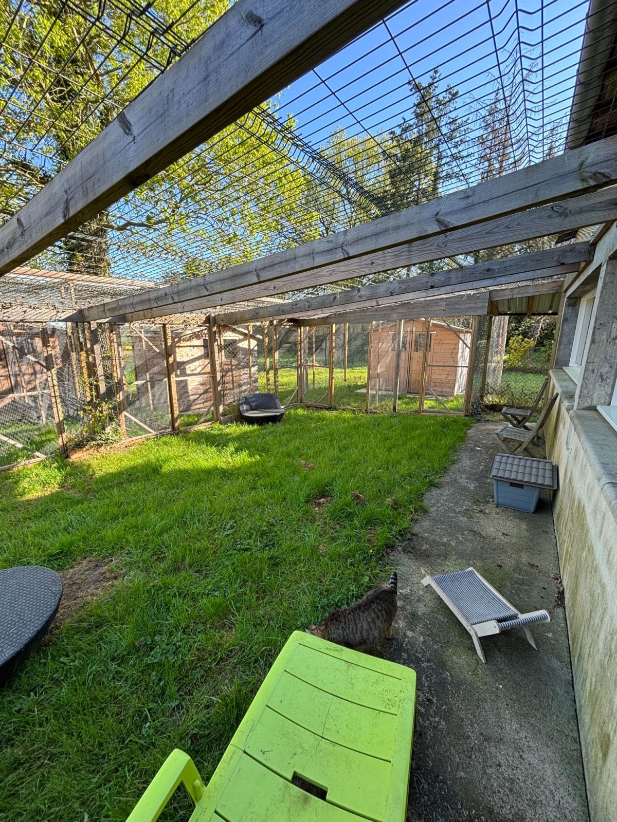 La pension de 80m² dispose de six chambres individuelles de 2 m² chacune et quatre chambres pour les familles nombreuses, situées côte à côte et orientées vers le nord pour maintenir la fraîcheur. Les chambres sont équipées de cloisons vitrées offrant une vue panoramique sur la campagne environnante. Une salle de jeux commune est équipée de divers jouets, parcours muraux et arbres à chats. Six chambres supplémentaires (famille de 2 chats possible dans chaque chambre) sont disponibles dans les chalets d'été. Les chalets ont chacun un jardin privatif pour permettre aux chats non sociables avec leurs congénères ou ceux avec des besoins particuliers de profiter de l'extérieur.