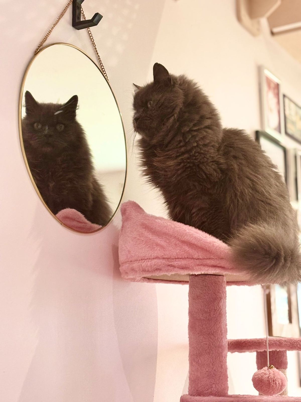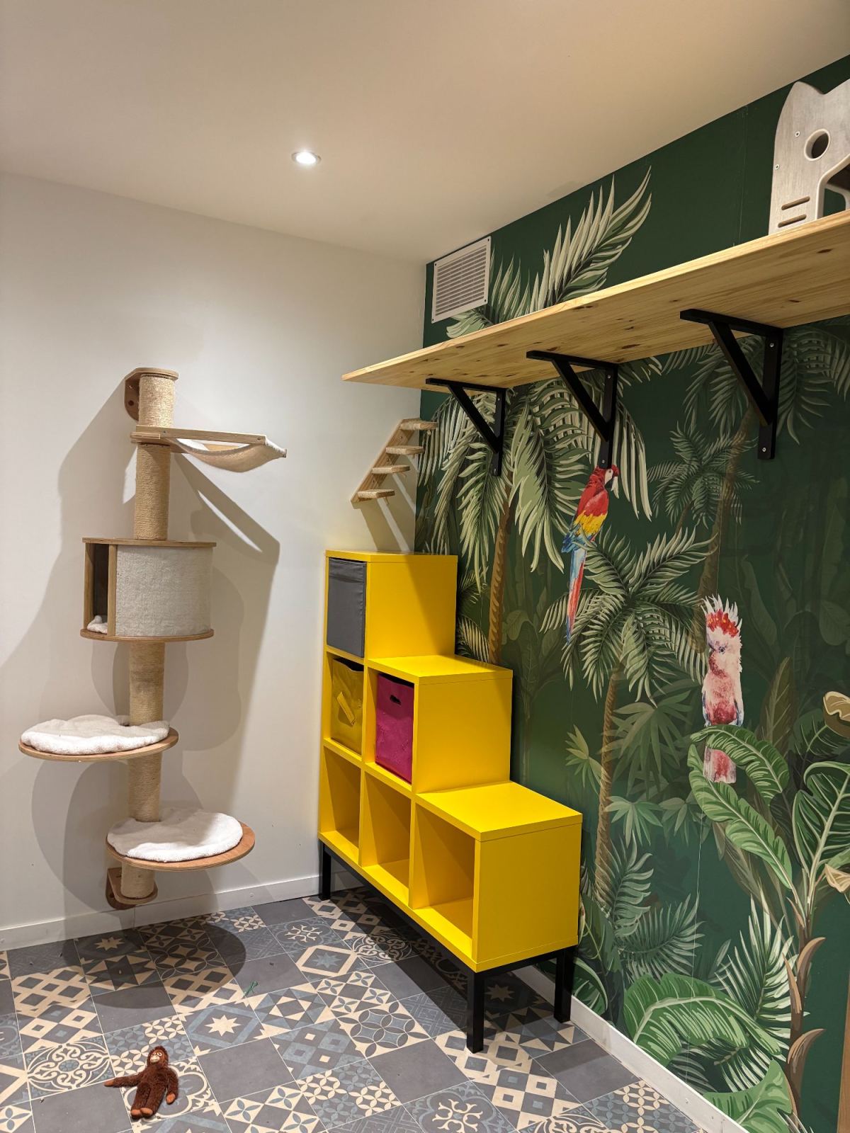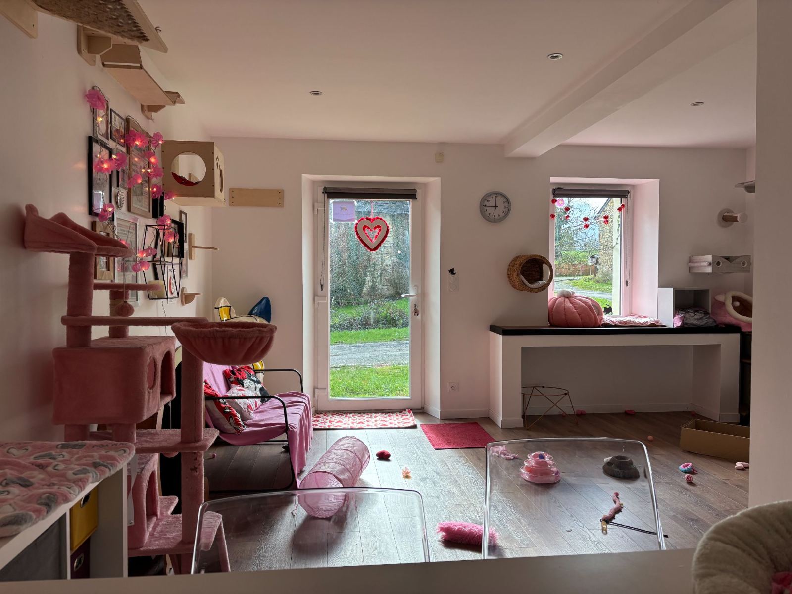 La pension de 80m² dispose de six chambres individuelles de 2 m² chacune et quatre chambres pour les familles nombreuses, situées côte à côte et orientées vers le nord pour maintenir la fraîcheur. Les chambres sont équipées de cloisons vitrées offrant une vue panoramique sur la campagne environnante. Une salle de jeux commune est équipée de divers jouets, parcours muraux et arbres à chats. Six chambres supplémentaires (famille de 2 chats possible dans chaque chambre) sont disponibles dans les chalets d'été. Les chalets ont chacun un jardin privatif pour permettre aux chats non sociables avec leurs congénères ou ceux avec des besoins particuliers de profiter de l'extérieur.