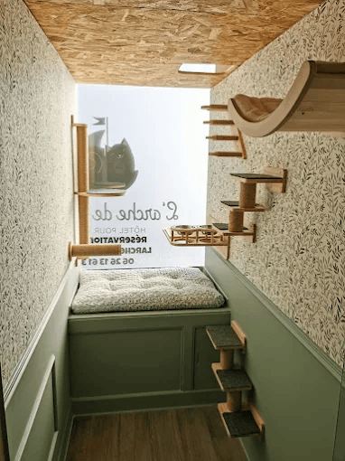 Les chambres sont isolées visuellement les unes des autres pour préserver la sérénité de chacun, tout en étant équipées d’une porte vitrée donnant sur les espaces communs, afin que les chats puissent observer leur environnement sans stress.